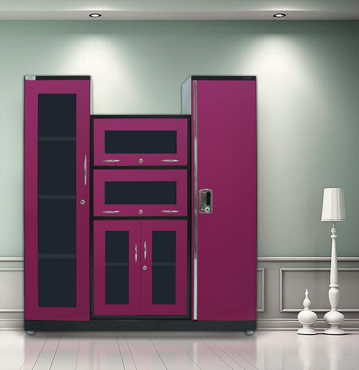 This CNC-designed "Steel Bit" showcase, in an elegant magenta metallic mirror finish, offers a sleek and modern aesthetic. Crafted from high-quality steel, it ensures durability and stability. The spacious design provides ample display space, making it ideal for homes, offices, or retail spaces, combining style with functionality