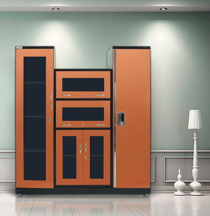 This CNC-designed "Steel Bit" showcase, in an elegant orange metallic mirror finish, offers a sleek and modern aesthetic. Crafted from high-quality steel, it ensures durability and stability. The spacious design provides ample display space, making it ideal for homes, offices, or retail spaces, combining style with functionality